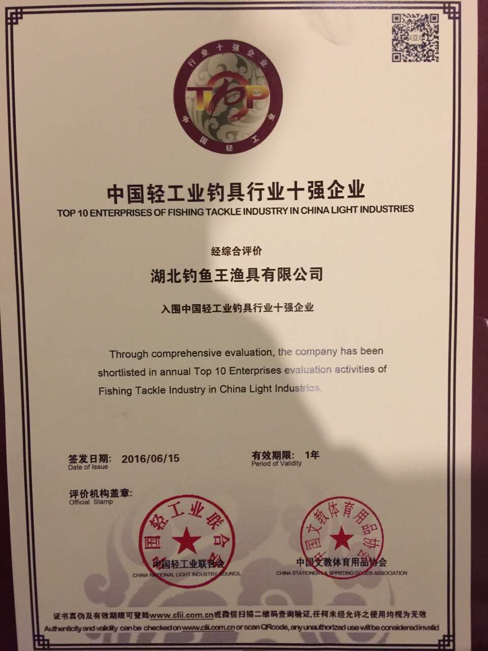 20年來,湖北釣魚王漁具有限公司始終秉持“為全球釣魚人服務”的企業理念,提供專業級休閑漁具產品和服務,專注塑造“樂享垂釣之尚”的釣魚王品牌,倡導優質時尚環保的健康生活。繼榮獲《人工釣餌水產行業標準》聯合起草單位之一的榮譽稱號、入圍“中國輕工業百強企業”榮譽榜單之后,又獲得了“中國輕工業釣具行業十強企業”的榮譽稱號,這是釣魚王20年品牌積淀的成果,也是廣大釣友和合作伙伴支持的結果。在此對大家的信任和支持表示感謝!