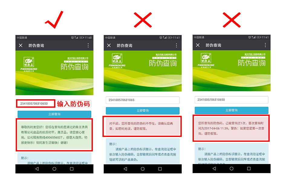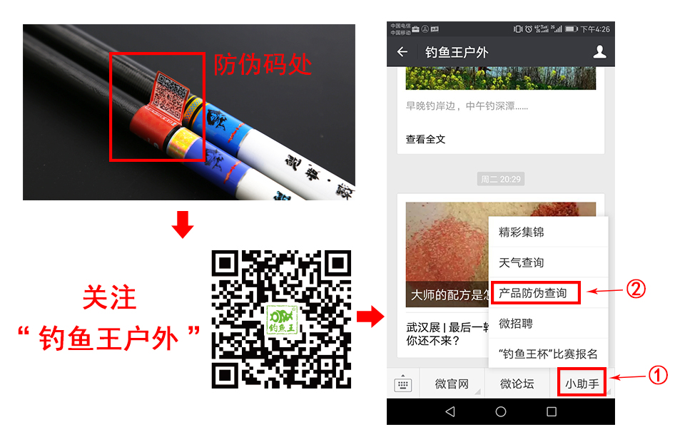 三、購買產品之后,廣大釣友可以刮開竿身防偽標上的涂層,在公眾號“釣魚王戶外”的“小助手”里查詢真偽。